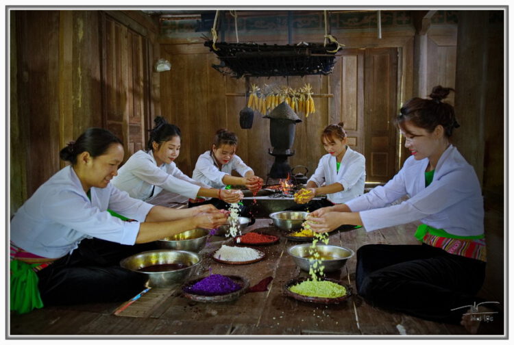 – After breakfast heading to Muong village for photo opportunity of Muong tribe ladies to see how they are cooking sticky rice with five different colour .